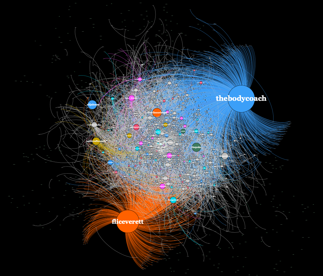 Furthermore, it is clear from our initial work here that how one employs techniques of social network analysis also influences how collectively we view people such as Joe Wicks, Flic Everett and Piers Morgan.