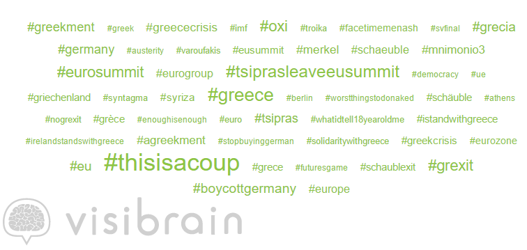 The figure above displays the most frequently used hashtags (in the month of July) alongside #ThisIsACoup, were: #greece, #boycottgermany, #grexit, #oxi, #greekment, #greececrisis, and #germany